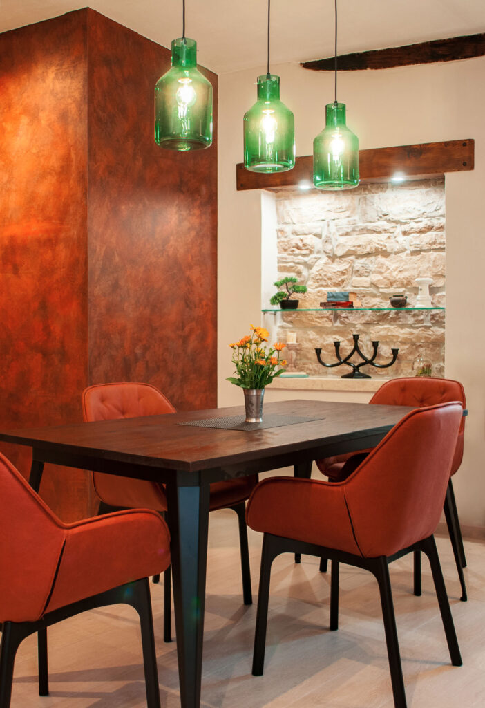 Apartman Pisino u Pazinu uređen je u kombinaciji modernog i rustikalnog stila, s naglaskom na prirodne materijale i autentičan karakter prostora. Kameni zidovi, topli tonovi drva i metalni detalji stvaraju sklad između suvremenog dizajna i istarskog ugođaja.